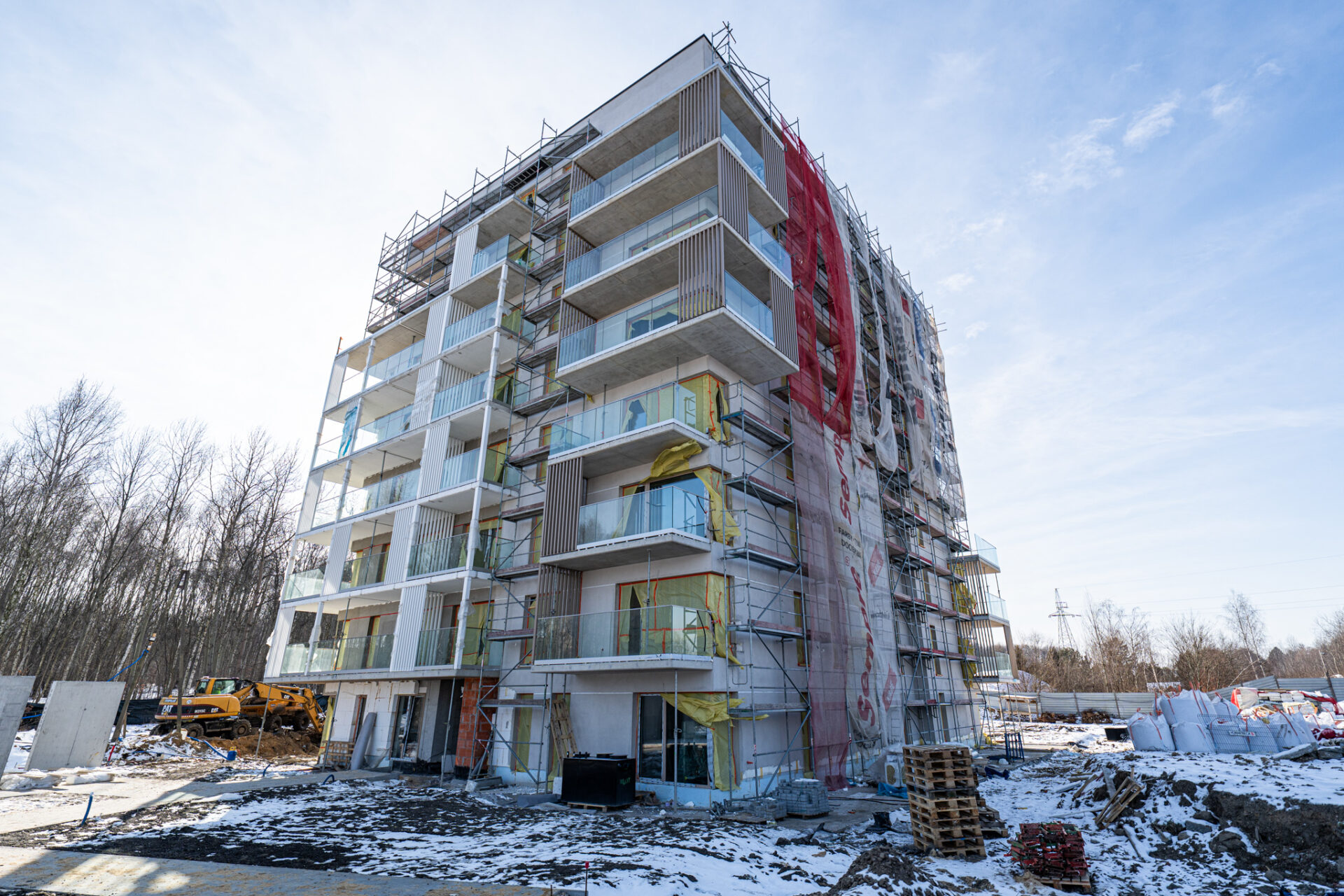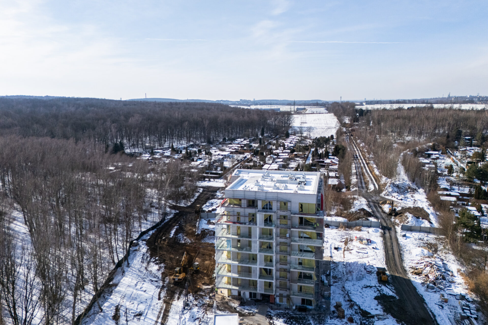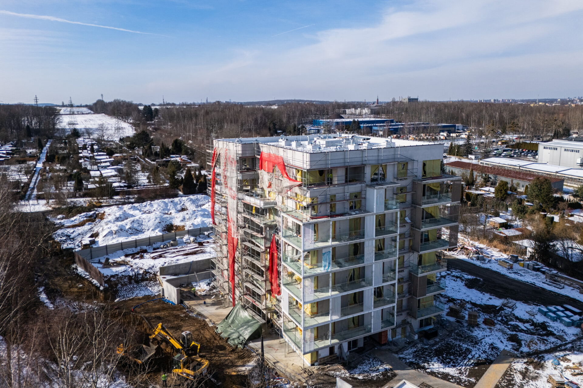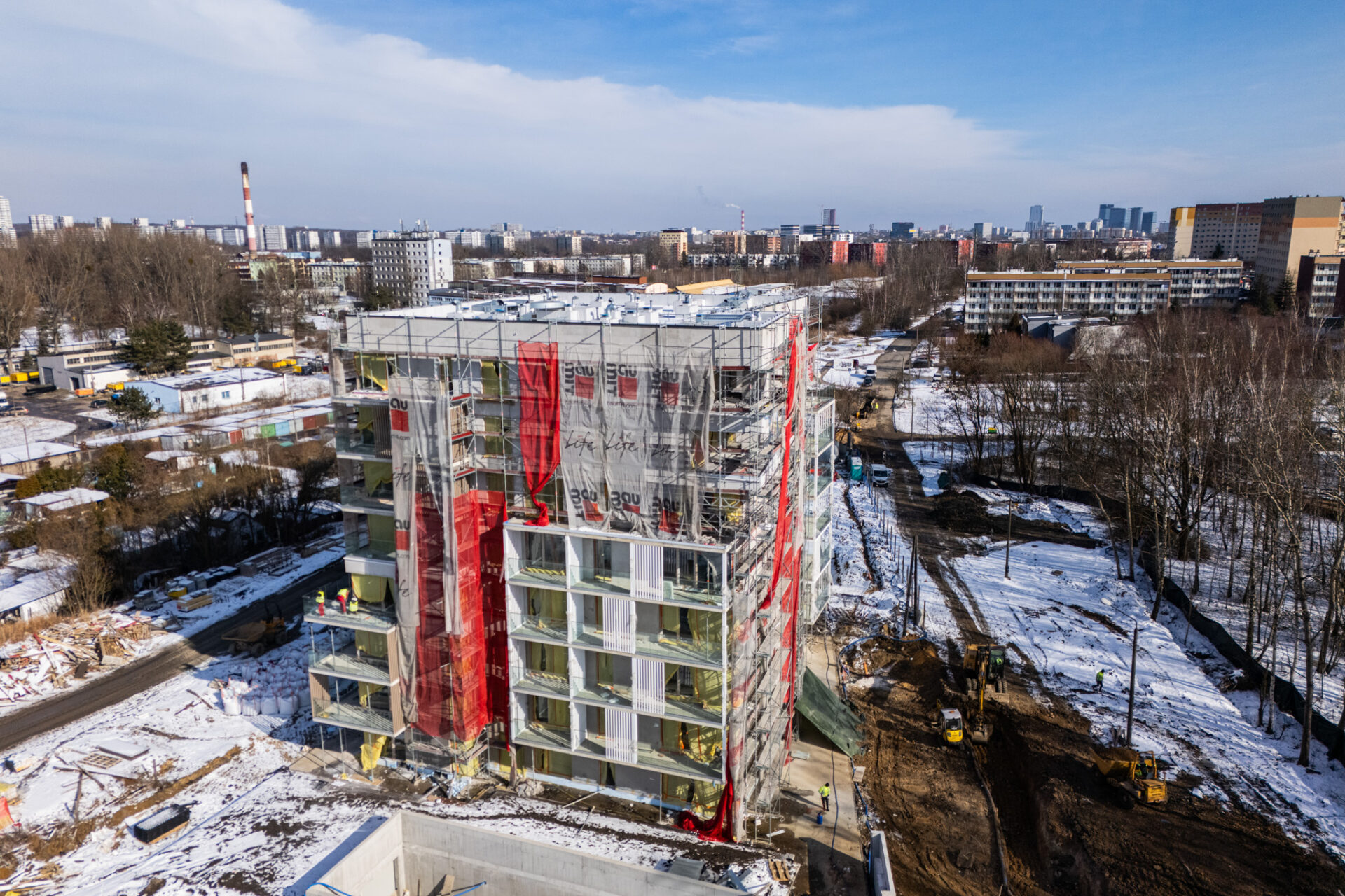 Prawdziwa zima od wielu, wielu lat w Polsce zaskoczyła chyba wszystkich. Nie możemy doczekać się więc już upragnionej wiosny, która zazieleni okolicę Grabskiego Park i która jest sprzymierzeńcem na budowach. Nadrabiamy zadania na każdym froncie w zakresie zewnętrznych prac drogowych, budowy miejsc parkingowych na terenie zewnętrznym oraz ziemnych robót w zakresie przyłączy docelowych mediów do budynku i zagospodarowania terenu. Wewnątrz trwają intensywne prace nad wykończeniem części wspólnych budynku. Mieszkania są gotowe 🙂 Oczekiwana ładna pogoda pozwoli nam dokończyć niebawem wszelkie prace elewacyjne i montażowe na zewnątrz budynku. Koniec budowy będzie widać z każdym tygodniem 🙂